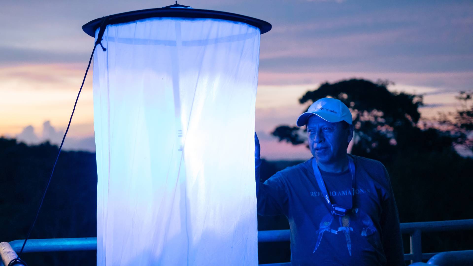 Biólogo de Wired Amazon recogiendo muestras en la trampa de luz LepiLED. Foto de Carlos González.