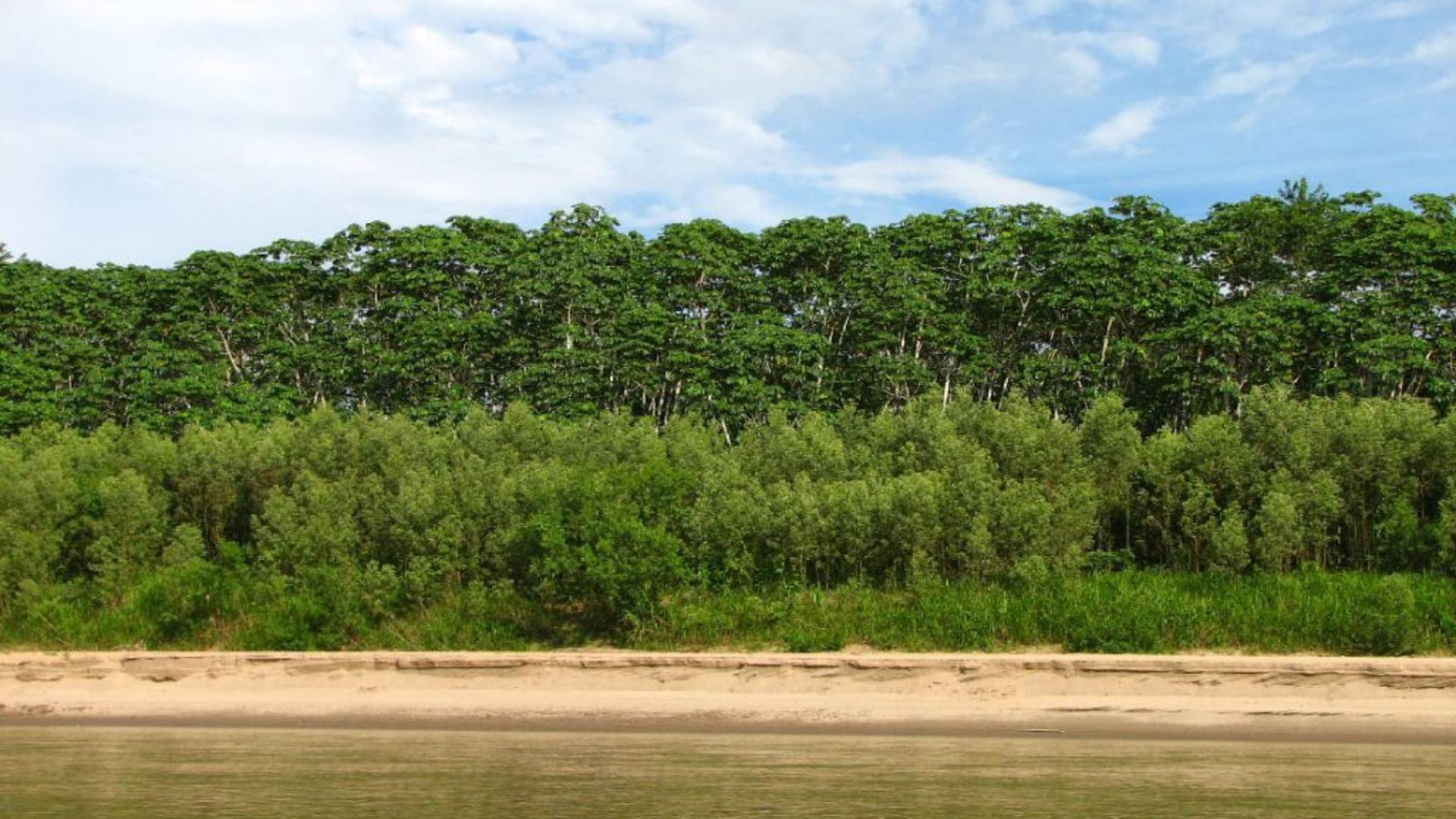 Traveling along the Tambopata River, visitors can see various stages of succession neatly laid out one after another. These chronosequences provide a feeling of "traveling through time", starting from the river beach through multiple successional stages all the way to mature forest.